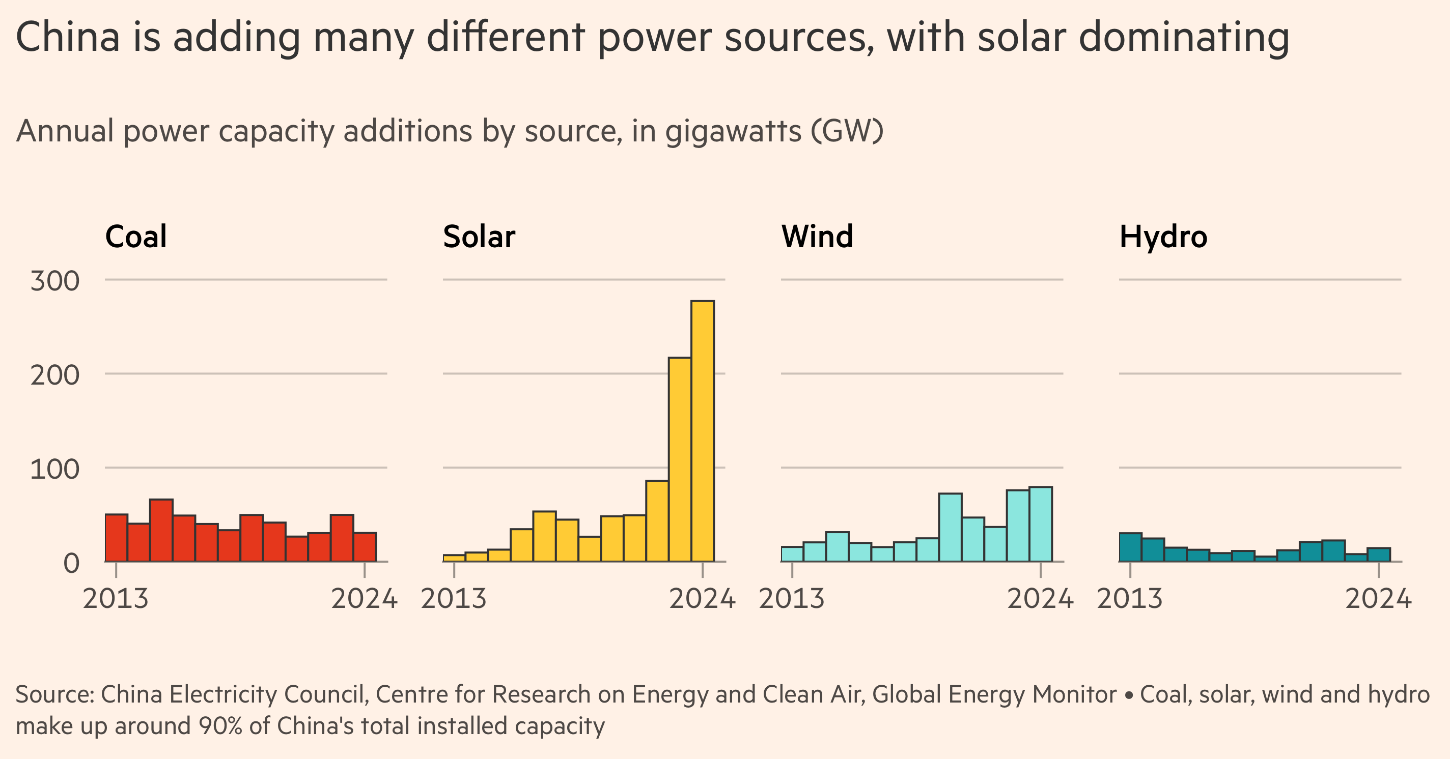 Coal, solar, wind, and hydro account for 90% of China’s electricity generation. Solar power now dominates new electricity generation. This lead isn’t because China cares about the environment [2]; it’s because solar is cheaper.